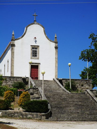 Nach Valezim sehen wir die Ermida de Nossa Sr. Da Saude de Valezim auf einem Hügel liegen. Wir machen einen kleinen Umweg, um sie uns anzusehen. Leider nur von außen möglich, da die Kirche leider geschlossen hat. Rund um die Kirche finden sich viele große schattige Bäume, Picknickplätze und ein Brunnen.