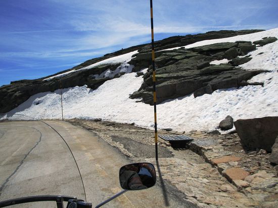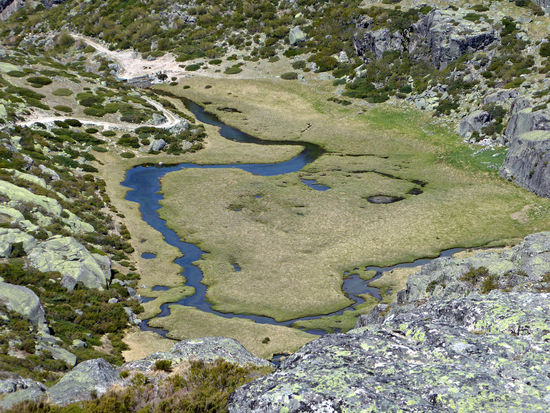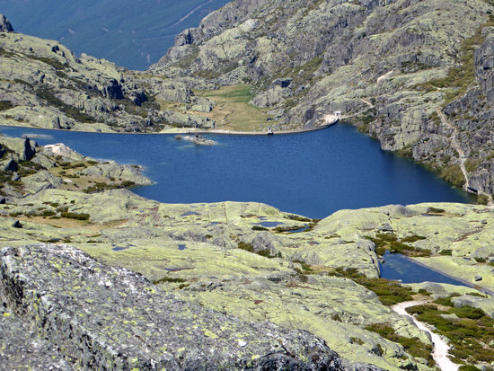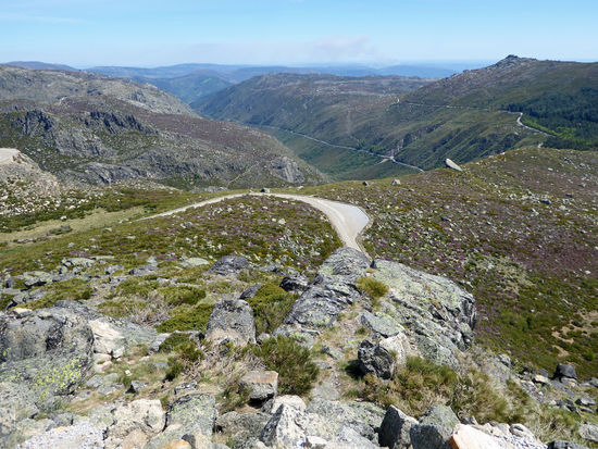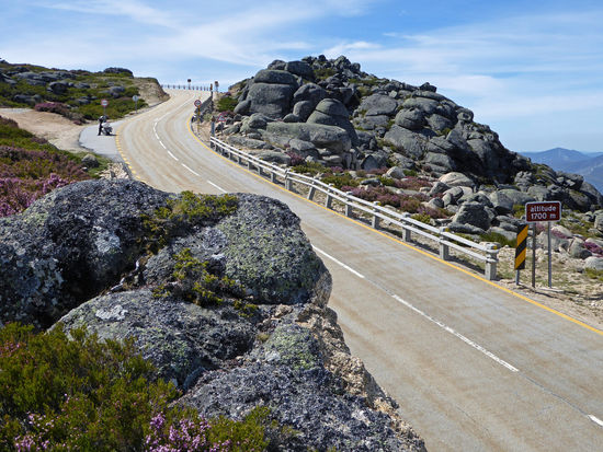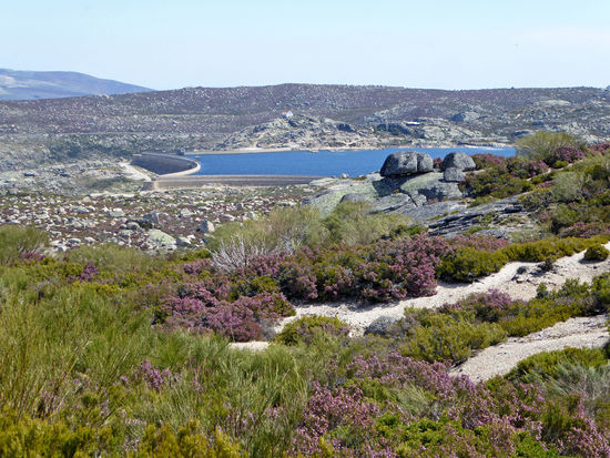 Eine herrliche Landschaft, die wir durchfahren – Parque Natural da Serra da Estrela. Doch die Fotos können kaum die Schönheit der Landschaft widerspiegeln. Zunächst viel blühender gelber Ginster, dann wechselt die Vegetation. Mir haben es besonders kleine rote Büsche angetan, die unserem Heidekraut ähnlich sehen. Die vielen Gletscherseen haben eine faszinierende blaue Farbe. Und immer wieder sind kleinere und größere Schneereste zu sehen. Bizarr sehen die Granitfelsen aus, wie aus einer anderen Welt.