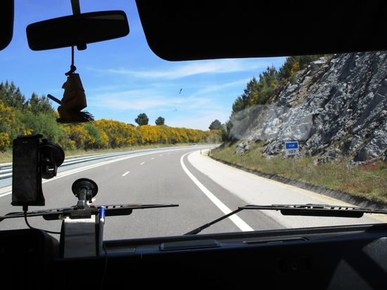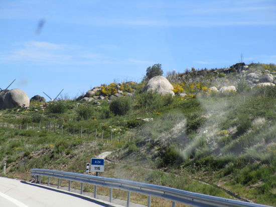 Wir kommen nach Peso da Regua, Vila Real. Rolf kennt die Gegend gut von seinem Camino. Die Autobahn führt hier steil hinauf auf 1.070 m, Serra do Alvao. Viel blühender gelber Ginster ist zu sehen. Zahlreiche Windräder stehen auf den Höhen.