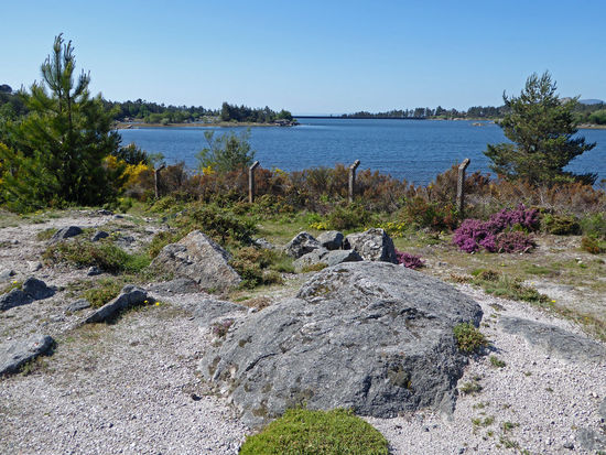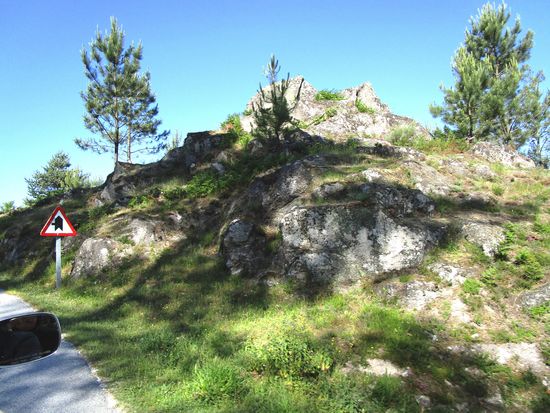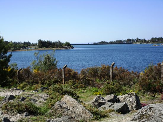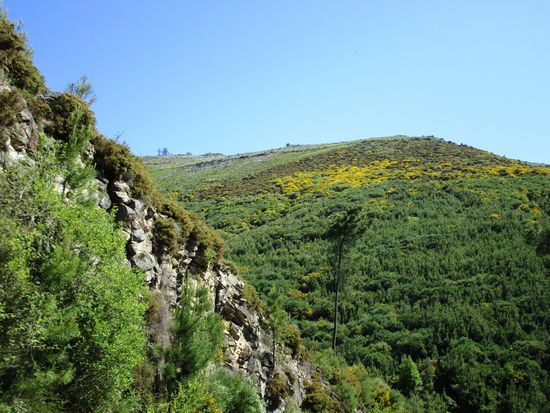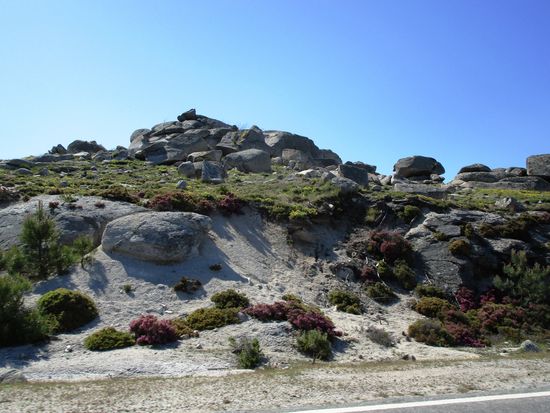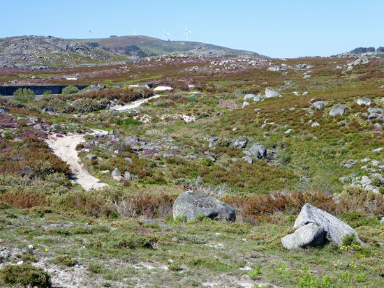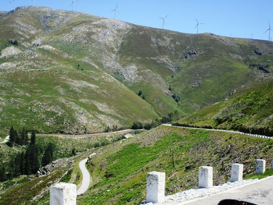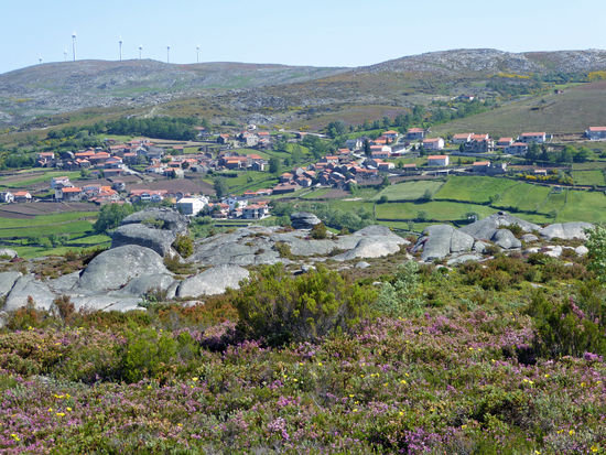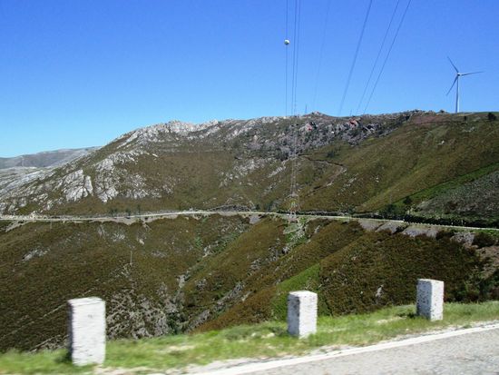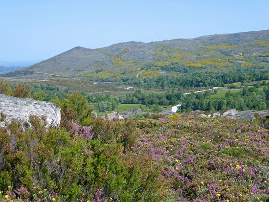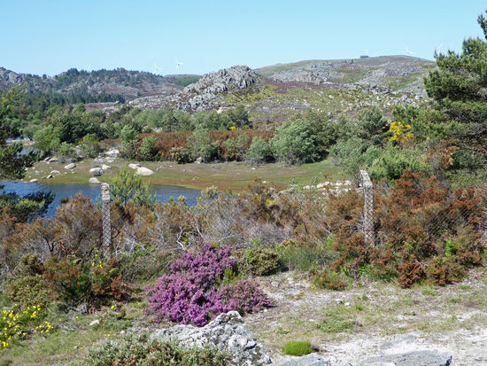 Wir durchqueren wieder den Parque Natural do Alvao, eine herrliche Gegend, viel Grün und schöne blühende Blumen. Gelber Ginster zwischen schwarzem Granit, sieht wunderschön aus. Dann gibt es noch rosa-violett blühende kleine Sträucher, wahrscheinlich eine Art Heidekraut. Sieht toll aus. Und hin und wieder erblicken wir kleine Bergdörfer. Schön der große Albufeira da Barragem Cimeira, ein riesiger Stausee. In ihm leben viele verschiedene Fischarten. Hin und wieder sind hier Otter zu sehen.