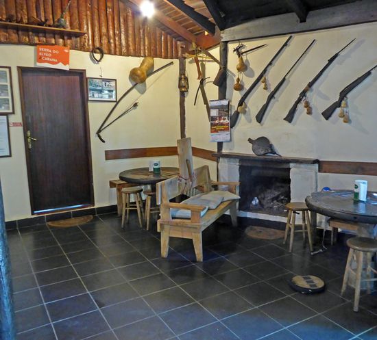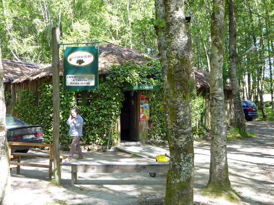 Bald kommen wir zu einer kleinen Waldhütte – A Cabana, die verwunschen ausschaut. Innen ist die Hütte mit allerlei Waffen, Gewehre, Pfeil und Bogen etc., geschmückt. Wir genehmigen uns ein Eis. Wir sind die einzigen Gäste. Auch auf der Straße sind uns heute keine Autos begegnet. Es scheint, als seien wir hier allein unterwegs.
