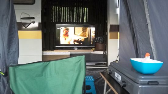 Heute Abend bleibt die Küche kalt. Rolf sorgt dafür, dass wir heute Abend draußen fernsehen können und nicht im warmen Bus. Toll.