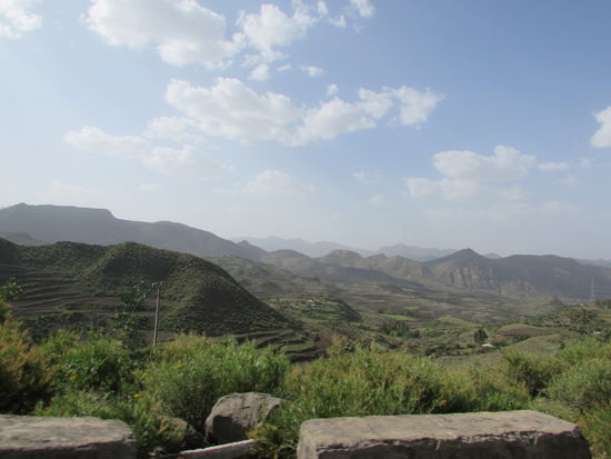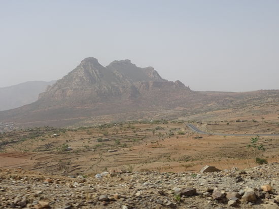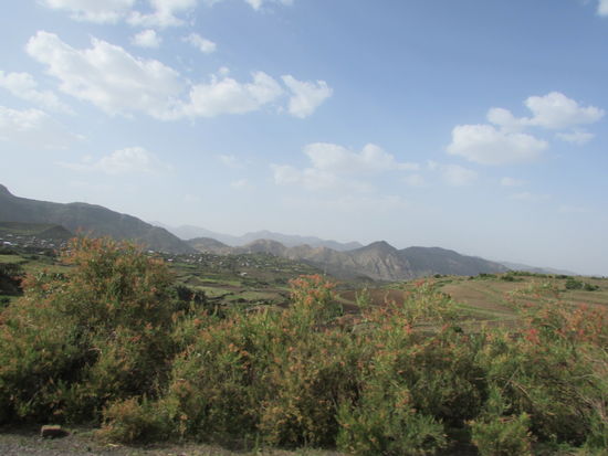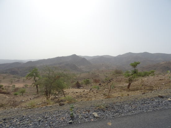 Dann erhält Happy einen Anruf, unser Fahrer samt Auto taucht auf. Er hat kleine 2 Stunden Verspätung. Wir beenden fix das Frühstück und holen unser Gepäck aus dem Bus. Wenig später sitzen wir in der zweiten Reihe eines Toyota SUV. Wir sitzen total beengt und können uns mit den Knien die Ohren zuhalten. Die Sicht auf die vorbeiziehende Landschaft ist eingeschränkt. Vor uns sitzen drei Studenten aus Axum. Die sitzen mit viel Platz entspannt vor uns. Wir haben kaum die Möglichkeit uns zu bewegen und so wird dieser Teil der Strecke echt zur Strapaze. Ich blicke neidvoll auf die Sitzreihe vor uns. Die Drei sind fröhlich und plaudern entspannt die ganze Fahrt.