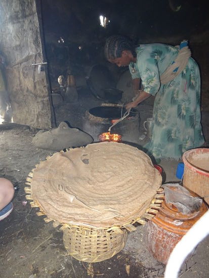 In dieser Hütte wird gerade Injera gebacken und man bittet uns herein. Dieser Einladung folgen wir sehr gern.