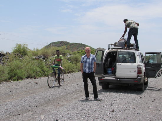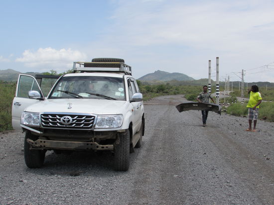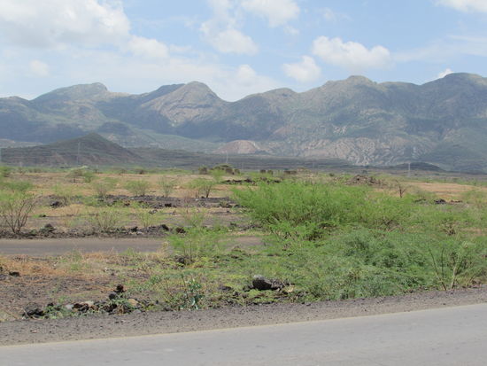Wir fahren auf der Straße nach Djibouti. Da Äthiopien selbst keinen Zugang zum Meer hat, werden die Häfen von Djibouti genutzt. Die Straße ist entsprechend stark von LKW's befahren. Parallel zu dieser Strecke sehen wir die neue Eisenbahnstrecke Richtung Djibouti.