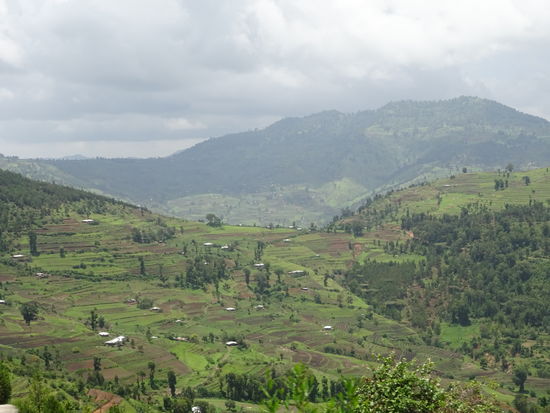 Dann kamen wir immer mehr in die wunderschönen Berge. Die Gegend hier ist stark zersiedelt. Die kleinen Bauern betreiben auf ihren terrassenförmig angelegten Feldern mühsam mit den Ochsen Ackerbau. Dank der Regenfälle in den letzten Tagen war alles sehr grün und die Luft angenehm kühl.