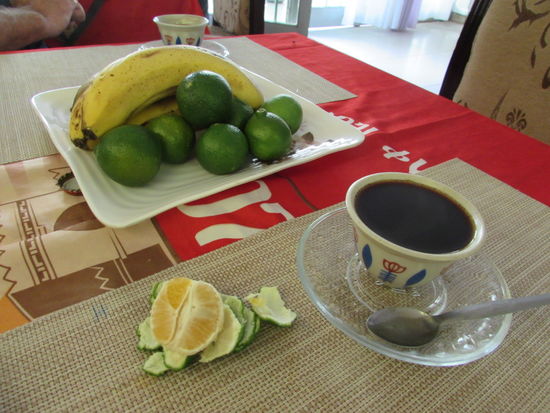 Nachdem wir an diesem Tag schon so viel gesehen haben, machen wir eine ausgiebige Pause im Hotel und geniessen dann eine Tasse Kaffee. Da das Internet nicht funktioniert muntert uns Daniel der Besitzer des Hotels mit Bananen und Mandarinen auf.