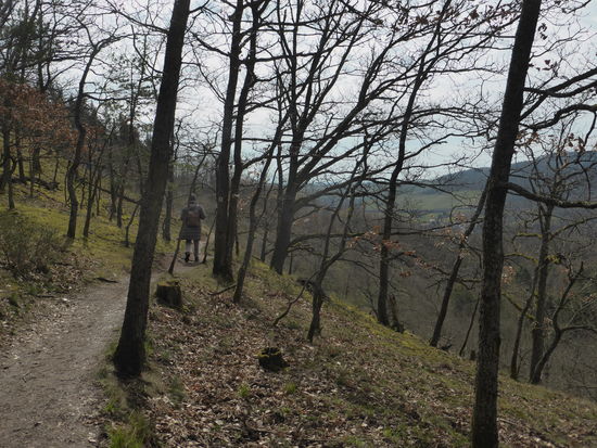 Wir streben jedoch weiter und beginnen wieder mit dem Abstieg der gewonnen 175 Höhenmeter. Auf dem Rückweg können wir einen tollen Blick auf den Trifelsen genießen und wenige hundert Meter weiter haben wir einen weiten Blick in die Rheinebene.