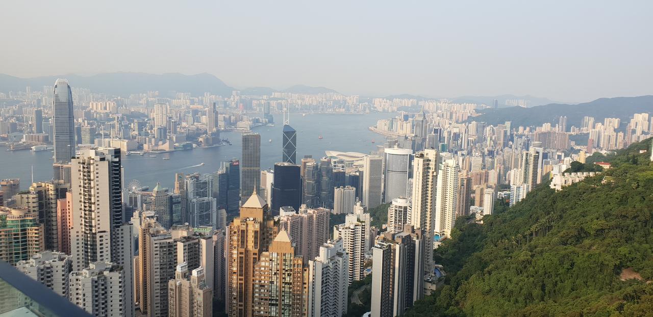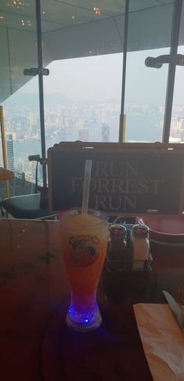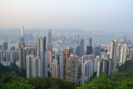 Der BigBus fuhr mich dann wieder zum Endpunkt am Pier. Ein netter Mitarbeiter den ich fragte, wann denn der nächste Bus kommt um zur Peak Tram zu fahren empfahl mir den Bus 15c, der schneller wäre. Er kostete auch nur knapp 4 Dollar. An der PeakTram konnte ich dann schneller durch den Einlass, da ich ja mein Ticket schon hatte. Trotzdem musste ich eine Weile anstehen, bis der Zug kam. Er transportierte uns dann den hohen Berg hinauf. Der Ausstieg führte direkt in ein großes Gebäude mit Restaurants und Shops und oben die Skyterasse. Ich hatte gelesen, dass sich diese nicht unbedingt lohnt, hatte den Eintrit aber mit dem Bigbusticket etworben.Es gab noch zwei kostenlose andere kleine Terassen, die auch schon nett waren. Der Ausblick oben war super. Im Gebäude ga es ein Bubba Gump Restaurant. Da wollte ich bereits in Amerika immer schon mal rein. Ich bekam einen Tisch mit genialem Ausblick auf die Skyline und das Essen war gut, wenn auch verhältnismäßig teuer. Nach dem Essen fand ich mal wieder den Ausgang aus dem Gebäude nicht. Das war wirklich nicht einfach, denn ich wollte nicht zur Tramstation, sondern zum Ausblick, den ich von oben gesehen hatte. Es hat sich auch gelohnt.