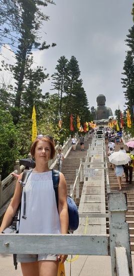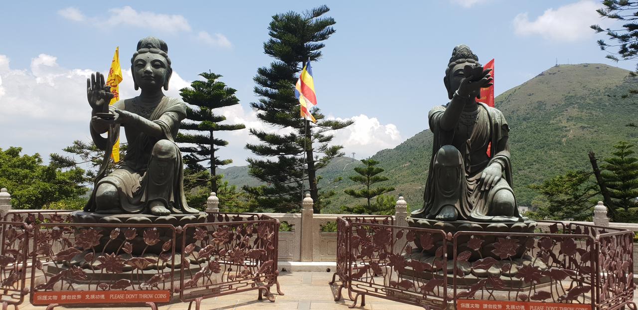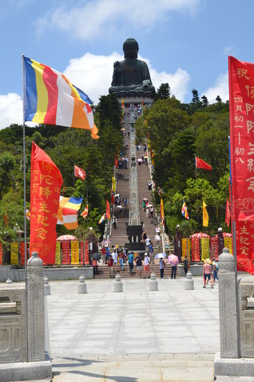 Nach dem Frühstück checkte ich im Hotel aus. Ich wollte den Shuttle Bus des Airtrains benutzen und die netten Hotelmitarbeiter meinten, sie sagen mir Bescheid wenn er kommt, so brauch ich nicht draußen in der Hitze zu warten. Zwischenzeitlich kam bereits die Putzfrau und brachte den von mir vergessenen Steckdosenadapter an die Rezeption. Oh super, den hätte ich noch doll vermisst. Der Bus kam jetzt auch und brachte mich in nicht mal 10 Minuten zum Bahnhof Kowloon. Hier gibt es einen Intown-Check-In für den Flug. So war ich innerhalb von 15 Minuten nach Verlassen des Hotels bereits mein Gepäck los. Für den Intwon-Check-In wird von der Octopus-Karte aber ein Airtrainticket abgebucht. Das nutzte ich gleich für die Fahrt bis Tsing Li und fuhr dann mit der MTR bis Tung Chung auf Lantau Island. Hier war gleich die Seilbahn zum Peak ausgeschildert. Ich kaufte mir ein Ticket für eine Kabine mit Glasboden (290 Dollar Hin-und Rücktour) musste ca. 20 Minuten warten und auf ging es Richtung Big Budda.