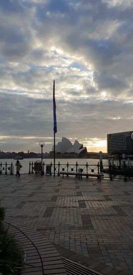 Mit wunderschönem Sonnenaufgang wurde ich in Sydney empfangen. Nun wieder das schon bekannte Procedere. Sehr schnelle und freundliche Immigration "Welcome to Australia Katrin" . Anschließend Koffer holen, Geld abheben und eine Karte für die öffentlichen Verkehrsmittel kaufen. Diese heisst hier Opal-Card und ist in 10 Dollarschritten aufladbar. Ich hatte mir 50 Dollar ausgerechnet, die ich benötige. Ich fuhr dann mit dem Train bis Circular Quai und stand eine Stunde nach der Landung bereits am Pier mir Blick auf die Oper. Mein Hotel Russell in the Rocks" war nur 300m vom Bahnhhof entfernt.