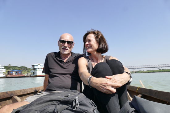 Der Ayarwaddy River ist einer dieser klassischen, asiatischen Flüsse, die zeitlos und gewaltig immer schon da gewesen sein müssen. Und solange es diese Flüsse gibt, wird die Welt im Gleichgewicht sein. Wir spüren, wie die Ruhe des Flusses auf uns übergeht. Kaum eine Welle bewegt das kleine Boot. Vorne sitzt der Alte, der sich am Anleger bescheiden im Hintergrund hielt, als gehörte er gar nicht dazu. Jetzt navigiert er mit sparsamen Handzeichen, pafft an einer riesigen Zigarre und lächelt versonnen. Die Ufer sind eher eintönig, aber diese Gleichförmigkeit trägt zur Entspannung bei. Abwechslung und kleine Wellen kommen auf, wenn riesige Lastkähne an uns vorbeiziehen. Sogar zwei schwimmende Luxushotels passieren uns. Ohne Neid, wir fühlen, dass wir besser unterwegs sind, als die Leute in den Kästen.