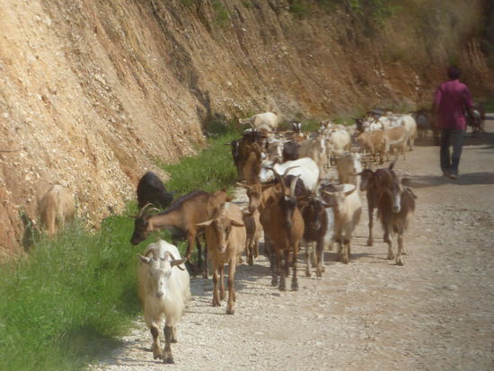 Kaum haben wir die Überlandstraße verlassen, wird es ungemütlich - Ivi nennt die Schlaglochstraßen 'Nostalgiestraßen' - eine Umschreibung für Strassenzustand aus kommunistischer Zeit. Deshalb begegnen uns dann auch ganze Ziegenherden.