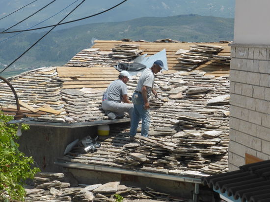 Erst einige hundert Meter weiter, wird es ruhiger und wir können uns die Steindächer genauer ansehen, die wie bereits in Butrint festgestellt, meist durch schrägstehende Hölzer abgestützt werden.