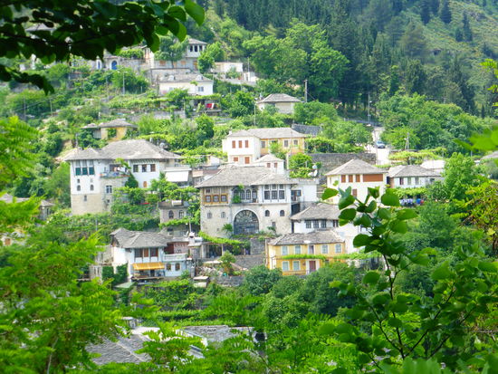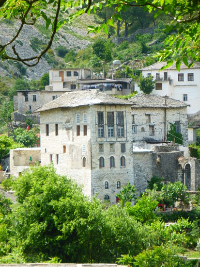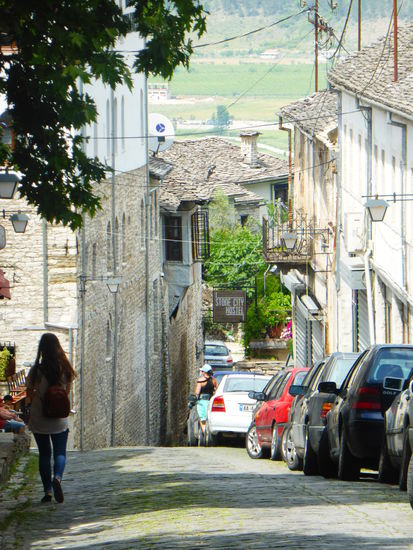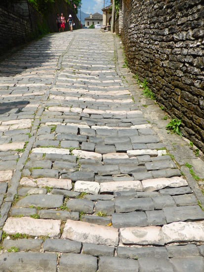 Wer durch die Straßen der Stadt spaziert, merkt, dass fast alles aus dem grauen Kalkstein der Region gearbeitet wurde: Die Häusermauern, die Dächer, ja sogar das Straßenpflaster erzeugen die Melange in Grau. Das Kopfsteinpflaster wurde meistens in der Zeit zwischen 1960 und 1980 ausgewechselt. Die zwischen die grauen Steine eingefügten schwarzen Streifen aus Stein ergeben ein schönes Muster und sind mittlerweile typisch für Gjirokaster. Die schwarzen Steine haben den Vorteil, dass sie nicht so rutschig sind wie die grauen; gerade bei Regen kommt dieses Pflaster Fußgängern zugute. Reiseführer - Treuschner-Verlag