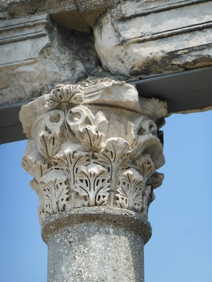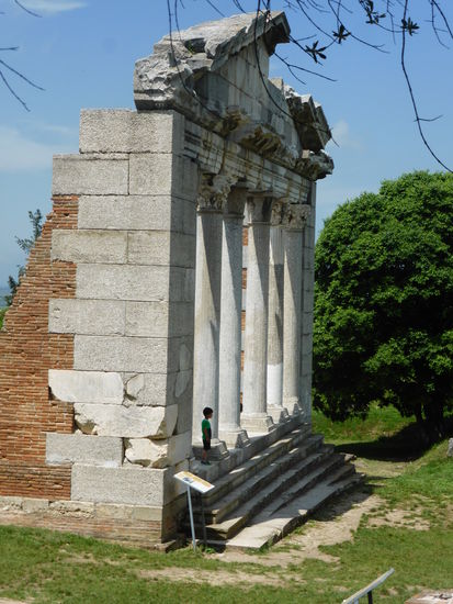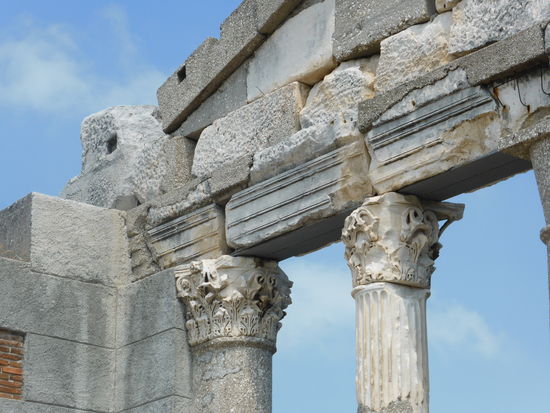 Obwohl bereits 1926 entdeckt, wurde das Gebäude erst 1976 rekonstruiert. Die Säulen bestehen aus Marmor und tragen z.T. gut erhaltene korinthische Akanthuskapitelle. Um das Portal wieder aufbauen zu können, sind allerdings einige Säulen in Beton ausgeführt.