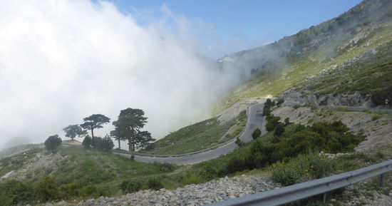 Hinter Orikum betreten wir den Nationalpark Llogara und ‚bezwingen‘ den gleichnamigen Pass (1027m). Obwohl uns Sicht bis nach Korfu versprochen wurde, legt sich eine Wolke davor, die vom Meer hoch gekrochen ist. Der Blick auf das über 2000m hohe Küstengebirge ist sehr schön.