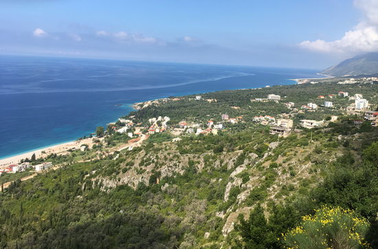 Überhaupt ist die Küstenlinie der albanischen Riviera absolut sehenswert, die Hänge stehen voller Olivenbäume über saftigen Wiesen, andere Hänge sind vollkommen mit wildem gelb blühendem Salbei bewachsen. Mehrfach steigen wir über Serpentinen hinauf und wieder hinab von einem Küstendorf zum anderen.