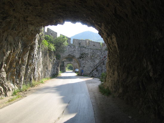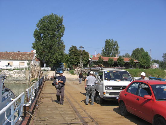 Zeit spielt hier offenbar keine Rolle, die Fähre kommt pünktlich, der Fährmann verschwindet in der Kneipe und sperrt die Zufahrt. Nur an der Zunahme des Autostaus erkenne ich, dass es irgendwann mal losgehen müßte. Endlich, um 13.25 Uhr kommt Bewegung auf, es wird kassiert (6,50 Euro) und es darf aufgefahren werden. Das Ablegemanöver mit der seitlich belegten Barkasse bei leichter seitlicher Strömung will gekonnt sein und auf dem Donau-Hauptstrom dröhnen die Motoren mit Vollgas, um uns voranzubringen. Die meiste Energie verpufft am Auspuffrohr zu Lasten der Umwelt, der Rest wird von den Reifenfendern aufgefangen, die achtlos über Bord hängen gelassen werden und sich im Wasser auch noch querstellen. Aber wir kommen gut auf dem Südufer an und quälen den Bulik auf einer schmalen Straße weiter ins Landesinnere. Hier stimmt unsere Karte überhaupt nicht mehr, wir werden auf den Donaudeich umgeleitet, haben aber dadurch romantische Ausblicke in die Stromebene, in der Pause aber auch erste Bekanntschaften mit Mücken. Eigentlich die beste Gelegenheit zum Radfahren, aber soviel Zeit haben wir nicht mehr, wir wollen wenigstens bis in die Donauschlucht, die nach 130 Kilometern zum Eisernen Tor führt. Die Schluchtstraße beginnt bei Golubac spektakulär mit einer Durchfahrt durch eine Burgruine, dann aber führt sie zwar dicht am Wasser entlang, ist aber auf beiden Seiten so zugewachsen, dass man nur selten Ausblicke aufs Wasser hat. So wird auch die Suche nach einem geeigneten Nachtlager schwierig. Einmal finden wir einen Hinweis auf ein "Camp" links von der Straße. Wir biegen links ein, fahren durch eine grüne Wildnis und kommen an einer kleinen Wiese heraus, auf der 5 neue Holzhäuschen mit je zwei Betten stehen und in die aufgestaute Donau hinein ist eine Art Clubheim mit Terrasse gebaut. Duschen gibt es auch: Hochgestellte schwarze Holzfässer mit Regenwasser, aus denen man mit einem Wasserhahn das Naß zapfen kann. Die Steinterrasse vor dem Clubheim ist der ideale Standplatz für Buliks Nebenzelt, selbst die Abendsonne erreicht uns genau aus der richtigen Richtung. Wir sind uns einig, das ist der schönste Platz bisher auf der ganzen Reise. Bis spät in die Nacht sitzt Horst auf der Terrasse und genießt den Sternenhimmel oder den Blick auf die Donau, auf der ab uns zu ein Schubverband vorbeifährt. Kein Platzwart, keine andern Gäste, wir sind die einzigen und bleiben es auch die ganze Nacht.