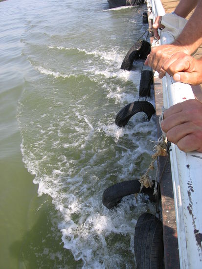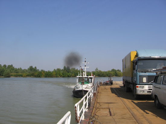 Auf unserer Karte ist eine Fährverbindung über die Donau eingezeichnet, die von Banatska Palanka nach Ram führen soll. Unsere Karte ist, obwohl Auflage 2005, nicht ganz genau, aber die Fährverbindung gibt es dennoch, dreimal täglich! Wir haben also über 2 Stunden Wartezeit, die wir ausnahmsweise mal zum Zubereiten eines Mittagessens nutzen, ausgerechnet unter dem Küchenfenster eines Fährrestaurants, das seine Pforten öffnet, als wir uns gerade richtig in der Morgensonne ausgebreitet haben. Man stört uns aber in keiner Weise, Krystof hält einen kurzen Klönschnack und weiß anschließend, dass die Fähre um 13 Uhr auch tatsächlich fährt.