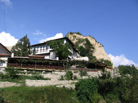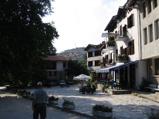 Bei solchem Wetter müßte man eigentlich eine Bergwanderung machen, aber wir befinden uns auf der Flucht in den warmen Süden, heute wollen wir Griechenland erreichen, allein schon der Wärme wegen. Also setzen wir uns in den Bulik und fahren talwärts. Auf der Europastraße 79 kommen wir sehr schnell voran, so dass wir nach einer Einkaufspause in Sadanski noch einen Abstecher nach Melnik machen können. Dort haben die Bewohner ihre Häuser teils in die Sandhügel gebaut und dabei einen ganz besonderen Baustil entwickelt. Der Melniker Wein soll außerdem Weltruf genießen. Der Ort verkauft sich jedenfalls gut, hier müssen Massen von Touristen aus Griechenland bei Tagestouren einströmen, es gibt mehr Kneipen als andere Häuser und man scheint jedem Ansturm gewachsen zu sein. Die Dorfstrasse ist wie ein kleines Rüdesheim, aber im gepflegten bulgarischen Baustil. Dennoch können wir ungestört unser Mittagspicknick auf dem Dorfplatz abhalten. Anschließend schlendern wir noch die Flaniermeile ab, heute sind wir hier fast die einzigen Besucher. Fast, zwei Schweizer Studentinnen treffen wir noch, die auch mit einem Bulik unterwegs sind und noch nach Istanbul weiter wollen. Unser Drang nach Süden ist nicht mehr aufzuhalten, obwohl wir hier schon wieder erträgliche Temperaturen haben.