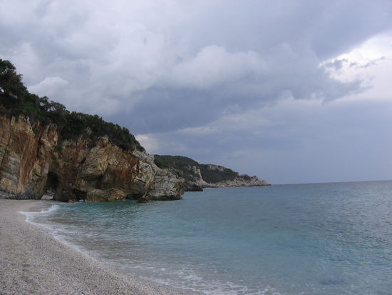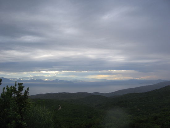 Nach der Montage kommt es noch dicker: Ein Wolkenbruch zieht über uns hinweg, wir retten uns ins Zelt auf Jörns Grundstück, Erinnerungen an die Nacht am Eisernen Tor werden wach, als diverse Rinnsale auch hier durchs Zelt fließen. Notwendige andere Reparaturarbeiten wie das Aufbauen des Zeltes für die Enkelkinder können wir nur in den Regenpausen machen und mein Dankbesuch bei Herrn Lück auf einem Grundstück oberhalb ist nach dem Regen nur barfuß oder in Gummistiefeln möglich. Gudrun, Horst, Toni und Krystof machen inzwischen eine Autotour durch die schönsten Teile des Pilion und kommen abends begeistert zurück, obwohl auch sie das Gewitter abbekommen haben. Aber die bessere Sicht nach dem Regen hatte ihnen tolle Blicke über die Bucht ermöglicht. Und sie haben reiche Walnußernte gehalten. Und sie bringen 12 kg Olivenöl von Achilles mit, das wir auf unsere Rückreise mitnehmen wollen. Auf der Veranda unserer Pension sitzen wir noch abends lange zusammen - es ist unser letzter Abend an der Küste, morgen treten wir den Rückweg an.