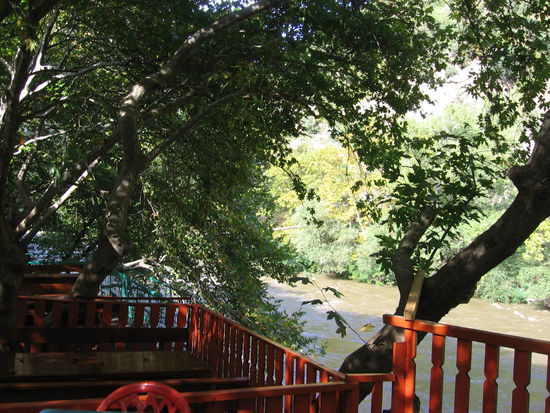 Was macht das Autofahren auf der feinen Straße nun für einen Riesenspaß! Horst muß uns mehrfach daran erinnern, dass es Mittagszeit ist und wir einmal Pause machen könnten, Krystof drückt auf die Tube und fährt manchmal ziemlich riskant. In einer Schlucht finden wir ein riesiges Ausflugslokal leer vor, machen es uns über den reißenden Fluten des Flusses gemütlich und picknicken aus unseren Vorräten, sogar die Getränke müssen wir selbst heranholen. Ein Paar spektakuläre Fotos, dann geht es weiter. Schaffen wir heute noch Sofia ? Wir schaffen es locker und kommen genau zur richtigen Zeit wieder zum Hotel Amfora, wo uns die Wirtin als alte Bekannte begrüßt, obwohl Krystof schon klargemacht hat, dass wir nur zum alten Preis übernachten wollen. Das ist doch selbstverständlich, erklärt uns die Wirtin, nur könnte sie uns unser Zimmer erst zuteilen, wenn sie weiß, wieviel Laufkundschaft noch ein Quartier braucht, die mehr bezahlt als wir. Aber unterkommen würden wir bei ihr auf jeden Fall.