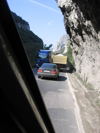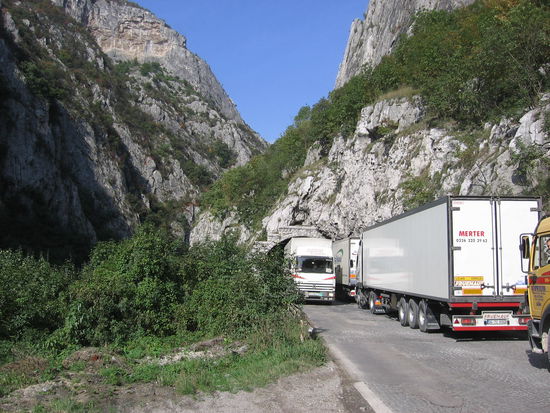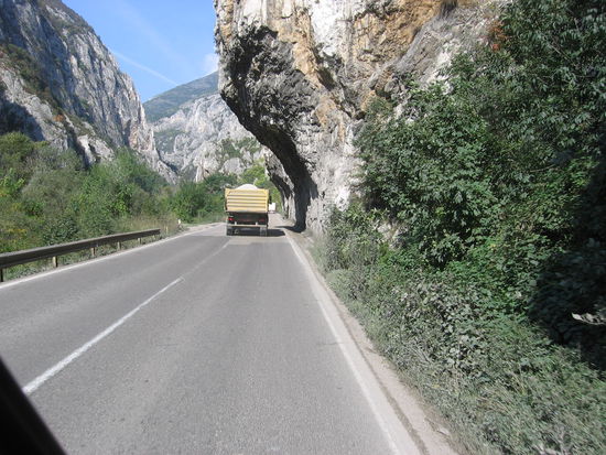 Nach dem herzlichen Abschied geht es flott voran Richtung serbischer Grenze, die nur 70 km hinter Sofia bei Kalotina verläuft. Der Grenzübertritt ist reine Routine, die Kopie der grünen Versicherungskarte reicht auch hier. Nun kann uns eigentlich nichts mehr passieren! Auf einer nagelneuen guten Straße geht es talabwärts Richtung Nis über Dimitrovgrad, Pirot, Bela Palanka. Eine Gegend wie in Oberbayern, aber weniger Verkehr und in Anbetracht der fortgeschrittenen Jahreszeit bei bestem Wetter. Kurz vor Nis wird es noch aufregend. Die Straße führt durch die Klamm der Nizava (Sicevacka Klisura), die Bahn verschwindet in Tunnels und die total zerfahrene Straße verengt sich auf eine Spur, weil die Lastwagen in den Tunnels nur in der Mitte der Fahrbahn fahren können, um nicht oben anzustoßen. Ohne Ampeln regelt sich auch der Gegenverkehr, die vielen türkischen Brummis, die hier fahren, scheinen sich alle untereinander zu kennen. Ich mache ein paar aufregende Fotos aus dem fahrenden Auto, bis wir vor Nis die Autobahn erreichen, auf der wir nun mit Tempo 100 weiterkommen. Trotz einstündiger Picknickpause schaffen wir es bis Belgrad. Kurz vorher müssen wir eine bittere Pille schlucken, als man uns für keine 300 km Autobahn satte 42 Euro Maut abnimmt, und schon Belgrad vor Augen gibt es eine Steigung, die Horst am Steuer des Bulik nicht mehr im zweiten Gang schafft. Die Brummis dagegen überholen uns rechts und links und wir stehen dazwischen fast.