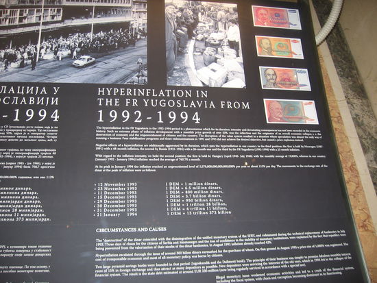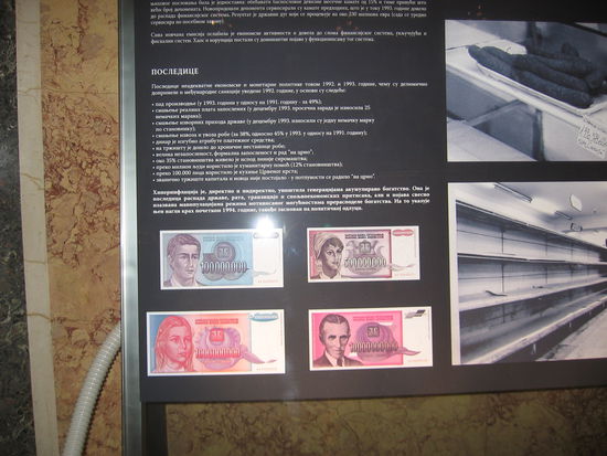 Wir entdecken das Haus der serbischen Nationalbank, die zum Besuch ihres Geldmuseums einlädt. Wir betreten das altehrwürdige Gebäude, das aufwändig restauriert ist und werden nach der Sicherheitskontrolle zum Museum in der ehemaligen großen Schalterhalle geführt. Eine junge Inspektorin übernimmt die Führung und wir bekommen Schätze zu sehen, die das Herz jeden Sammlers höher schlagen lassen würden. Münzen mit der Prägung vom Vater Alexander des Großen, Geldscheine mit -zig Nullen aus der Zeit der großen Inflation, die erst wenige Jahre zurückliegt und einen Hochglanzprospekt über die neuen Noten und Münzen der Notenbank von Serbien und Montenegro - nicht mehr von Jugoslawien. Zum Schluß erzählt uns die Inspektorin noch, wie begeistert sie von der Internetseite des Geldmuseums der Deutschen Bundesbank sei, ihr Wunschreiseziel sei nun Frankfurt - aber wer weiß, ob sie dorthin jemals kommen könne.