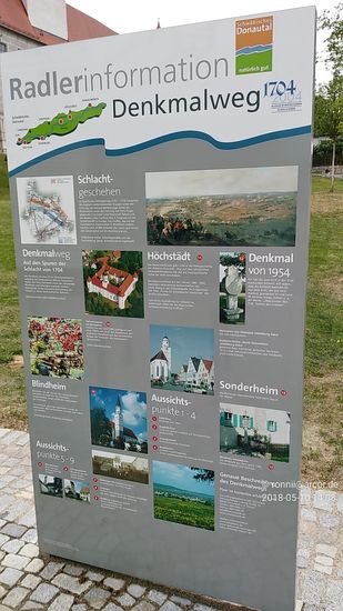 Am 13. August 1704 trafen hier im Spanischen Erbfolgekrieg die kaiserlich englischen Truppen und das französisch-bayerische Heer zur Entscheidungsschlacht mit ca. 24500 Toten aufeinander. Durch den Sieg der Engländer wurde ein drohender Marsch der verbündeten französisch-bayerischen Armeen auf Wien verhindert.