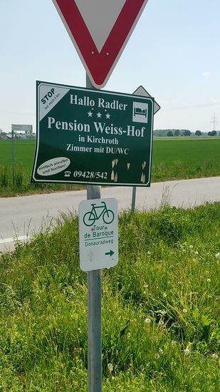 Übrigens für zukünftige Donau-Radltourer: Gleich hier rechts am Standort des Schlauchautomaten befindet sich die Gaststätte "Zur Walba" mit Fremdenzimmern, praktisch direkt an der Donau gelegen, die hier gleich linkerhand der kleinen und verkehrsarmen Straße in Blickrichtung fließt.