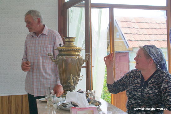 Bei unserem Gespräch mit dem Ehepaar bekommen wir Blini und Kartoffeltaschen serviert, der Samovar läuft ohne Unterlass, der Tee auch..