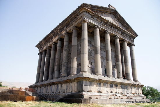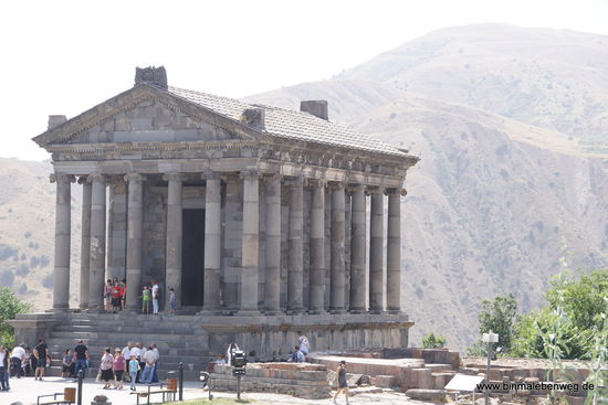 Bereits 3000 vor Christus war die Gegend bewohnt. Der Azat wirft dort eine Schleife, die zweifellos leicht zu verteidigen war. In ein paar Jahren wollen Archäologen dort etwas tiefer graben. Tacitus ist der erste, der im ersten Jahrhundert vor Christus die Festung von Garni erwähnt. Erhalten sind heute noch das Badhaus und vor allem der Tempel. Man vermutet, dass dieser von König Tridates mit Geld von Nero errichtet wurde. Mit dem Bau wurde wahrscheinlich 115 nach Christus begonnen. Der Anlass wäre demnach die Eingliederung Armeniens ins Römische Reich.