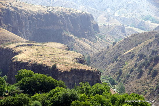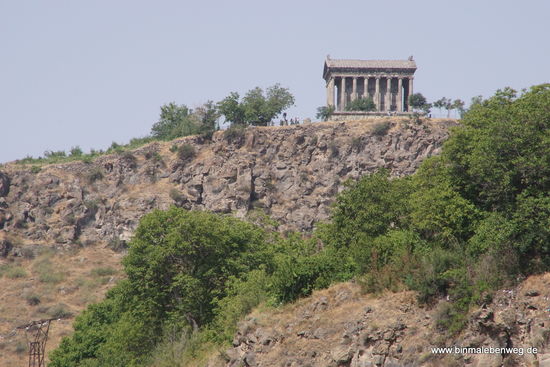 Vom Talboden aus sieht man schon den Tempel von Garni hoch oben.