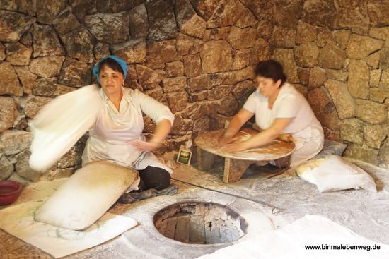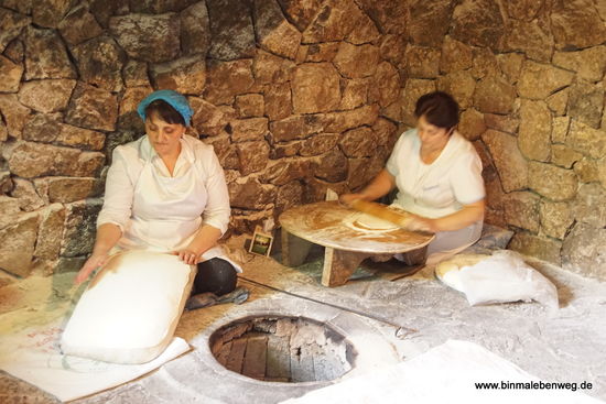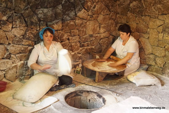 Mittagessen gibt es unweit der Tempelanlage in einem Bauernhof. Zum typisch armenischen Essen gibt es wieder frisches Lavash, wir schauen den beiden Bäuerinnen zu, die extra für uns frisch backen.