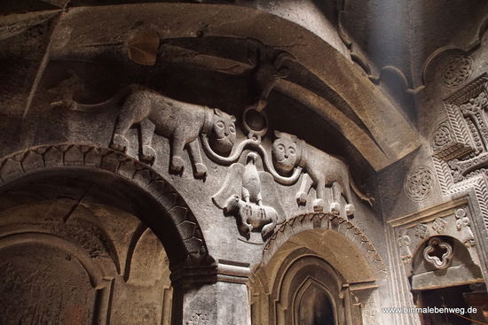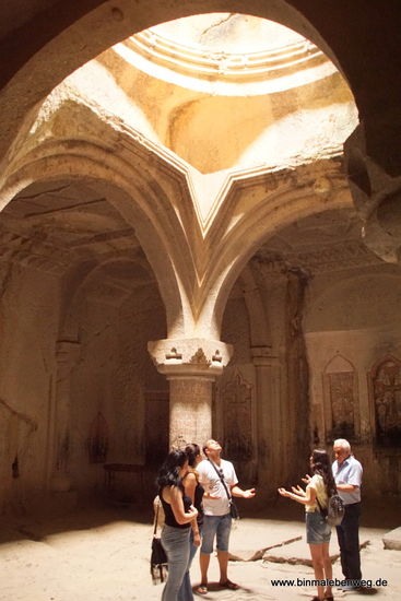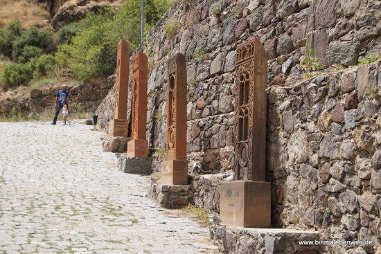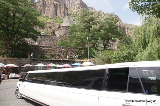 Im oberen Azatal besichtigen wir das Kloster Geghard, Weltkulturerbestätte. Wir begegnen hier wieder der armenischen Handwerkskunst Chatschkar. Am Parkplatz steht eine Stretchlimousine, das Brautpaar war mir einige Minuten vorher über den Weg gelaufen. In er Zwischenzeit war der Fahrer schwer beschäftigt, denn heute ist nicht nur Sonntag, sondern auch Eriwan ist nicht weit weg, so dass viele Einheimische ihren Weg hierher finden. So eine Stretchlimousine auf dem kleinen und überfüllten Parkplatz zu wenden ist gar nicht so einfach. Ich schaue mit einem CCCP-Eis in der Hand zu.