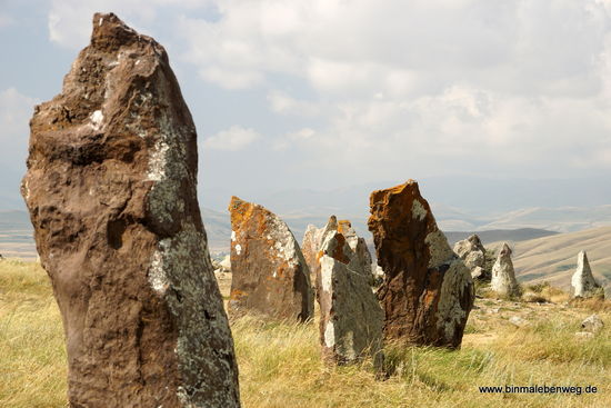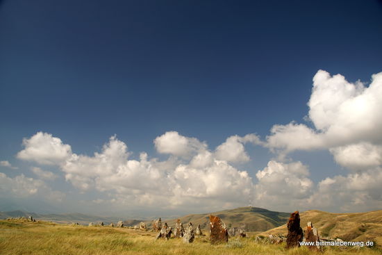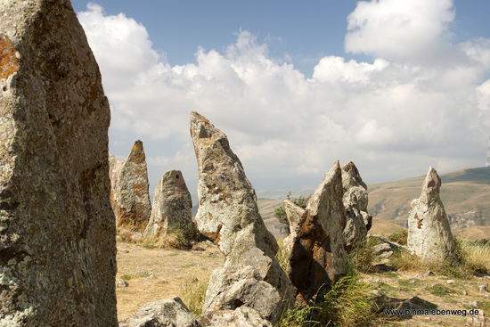 In der Mitte vom Nirgendwo, in einer weiten Hochebene, weit weg von jeder menschlichen Ansiedlung, entdecken wir plötzlich Steine, ringförmig aufgerichtete Steine. Dolmen, wie sie auch in Stonehenge oder beim Ring of Brodgar (Orkneys) stehen könnten. Wir sind in Karahunj, eine der größten und ältesten prähistorischen Kultstätten des Landes. Hier stehen Dutzende tonnenschwerer Steine in bestimmten Mustern aufgestellt, viele davon mit fingergroßen Löchern. Wer hat diese Steine aufgestellt? Wie? Und vor allem: Warum? Es muss den Menschen ungeheuer wichtig gewesen sein, dass diese Steine aufgestellt werden. Warum sonst soll man solche Strapazen auf sich genommen haben? Ich kann mir vorstellen, es war für einen Menschen, damals vor Tausenden von Jahren ein unglaublich erhebendes Gefühl, wenn er über die Ebene lief und sich plötzlich diese Steine vor ihm aufbauen. Etwas Vergleichbares gab es ja im weiten Umkreis nicht.