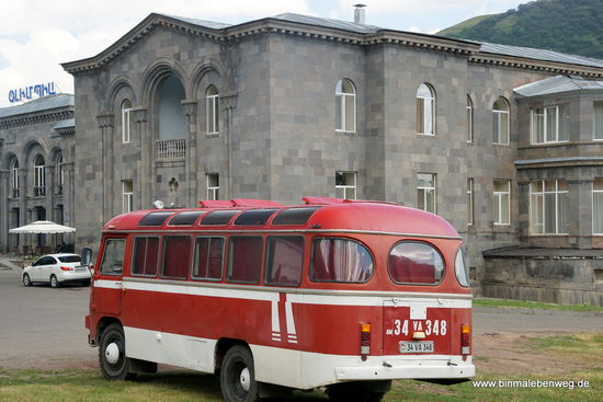 In Jermuk, wo das Mineralwasser herkommt, das sich seit Tagen trinke, machen wir eine kleine Radtour. Leider sind die Mountain Bikes alles andere als in gut in Schuss. Sie sind eher erschossen! Meine Vorderbremse geht gar nicht, meine Hinterbremse – was ich erst beim Bergabfahren merke – geht auch nur so halbwegs. Und schalten kann ich so viel ich will, ich bleibe immer im 18. Gang. Die Arpa-Schlucht runterwärts merke ich das nicht großartig. Am unteren Ende des Sees angekommen, erfahren wir, dass wir die gleiche Strecke wieder zurückfahren. Das war eigentlich anders kommuniziert. So eine kleine Radtour ist ja nicht schlecht, dann aber bitte entweder als Rundkurs mit funktionierenden Rädern oder nur bergab mit Abholung unten sowie einen Begleiter, der wenigstens über ein Minimalwissen zu Fahrrädern verfügt! Jungs, nicht ich soll Euch sagen, wie etwa geht, sondern bitte umgekehrt!