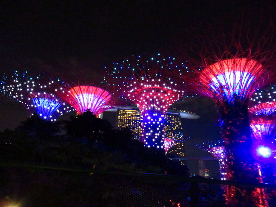 Hinter dem Hotel Marina Bay Sands Hotel liegt der Garden by the Bay. Auch dort gibt es jeden Abend eine Lichtshow passend zur Musik. Es ist ein schöner Park mit etwas speziellen Bäumen, die sind aus Eisenstangen und ober drauf haben sie Solarzellen, voll high-tech. Dort möchte Singapur zeigen, dass man zur Umwelt und den Pflanzen sorge tragen soll. Der ganze Kreislauf der Natur wird erläutert um den Menschen zu zeigen, dass der Regenwald unsere Lunge ist. Ich finde es recht gut gemacht und lasse es mit nicht nehmen auf die Plattform zu steigen die zwischen diesen Bäumen hängt. Von dort oben hab ich einen schönen Überblick über die Stadt. In dem Park gibt es noch 2 Glaskuppengebäude, im einen ist ein Regenwald mit vielen tropischen Pflanzen angelegt und im anderen sind Pflanzengärten aus der ganzen Welt.