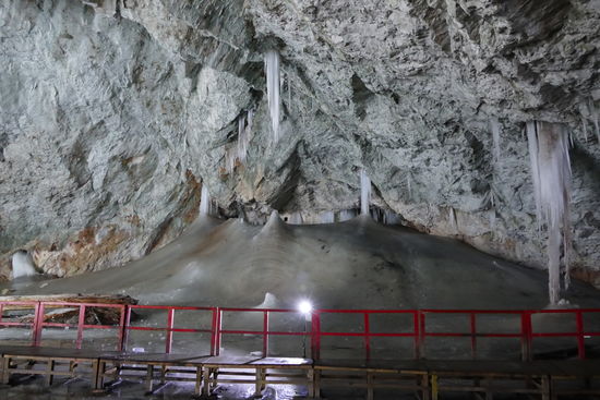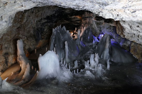 Über eine abenteuerliche Eisengitter-Treppe geht es hinunter in den Höhlenschlund. Nichts für schwache Nerven. Mit jedem Schritt wird es kälter und kälter und wir sind froh um unsere warmen Jacken. Unten führt ein teilweise vereister Holzsteg durch eine fantastische Eislandschaft aus Stalagmiten und Stalagtiten. Wir sind alleine hier unten und hören nur das Tropfen der schmelzenden Eiszapfen im Eingangsbereich. Unglaublich, was wir zu sehen bekommen in diesem ewigen Eis.