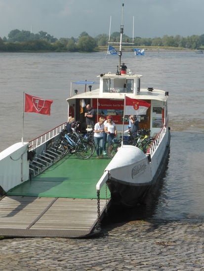 Neben der erst in den 90er Jahren gebauten Rhein-Brücke zwischen Kalkar und Rees verkehrt für Fußgänger und Radfahrer nochj eine kleine Fähre.