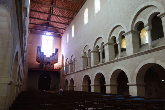 Das dunkle und strenge Langhaus ist 36 m lang. Acht große Rundbogenarkaden ruhen auf recht niedrigen rechteckigen Pfeilern. Der hölzerne Dachstuhl ist eine Kopie des Originals aus dem 16. Jh.
