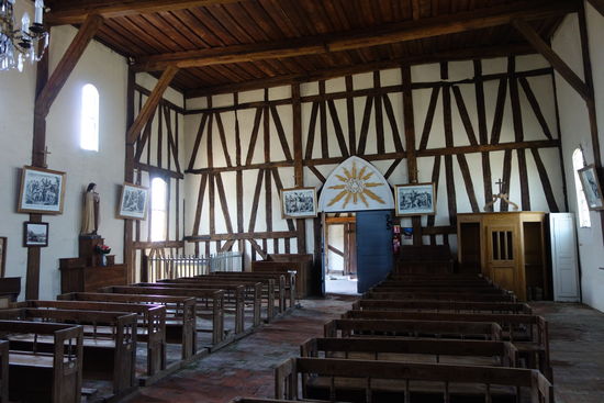 Das wahrscheinlich im 17. Jhdt. errichtete Bauwerk ist eigenartig angelegt: es besitzt einen eckigen Kirchturm, ein breites Hauptschiff ohne Seitenschiffe und einen etwas schmäleren und ziemlich tiefen Chor. An der Aussenseite der Kirche ist die Anordnung des Fachwerks sehenswert durch welche eine Straffung der hohen Fassaden erreicht wurde. Die Mauern wurden hiedurch in vier horizontale Streifen gegliedert vor denen jeder ein anderes, regelmässiges Dessin zeigt. So wie in anderen Fachwerkkirchen zeigt auch hier eine kleine geschnitzte Konsole am Pfosten die Verbindung mit dem Strebeband an.