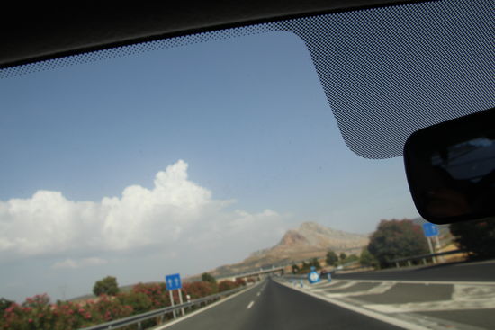 Es wird hügeliger. Zwischen den Leitplanken sind immens dichte Oleanderhecken. Allerdings auch auf einigen Strecken total braun... Auch hier hat es monatelang nicht geregnet - man sieht es der Landschaft an: alles braun. Es wird hügelig mit vielen Olivenhainen.