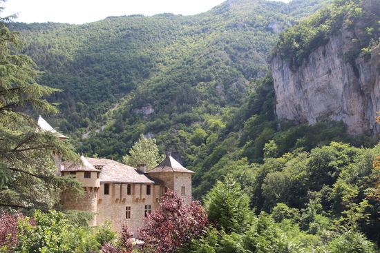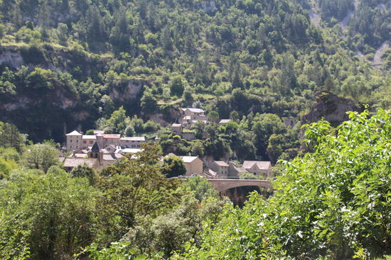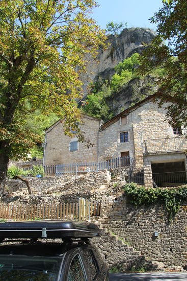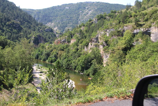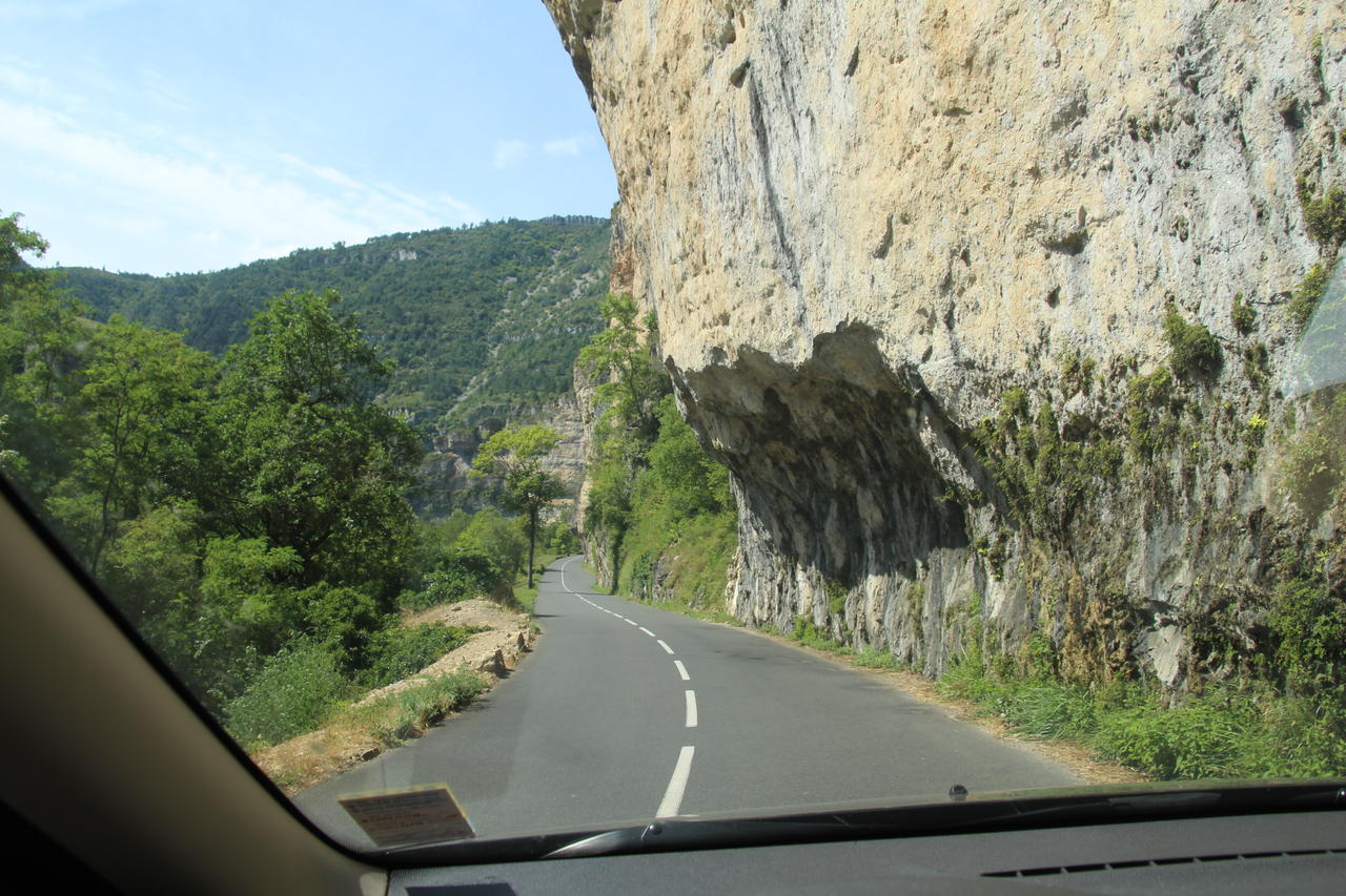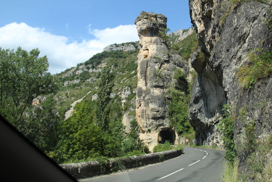 Ein guter Entschluss: zwischen St. Enimie und Millau geht die Straße am Fluss Tarn entlang. Hohe Felsen, die teilweise in die Straße ragen. Ich bin froh, dass ich fast immer an der Felsseite, nur ganz selten an der Abgrundseite fahre. Und wieder auch sehr glücklich, kein Wohnmobil zu fahren. An einigen Stellen liegen Glassplitter am Straßenrand. Da wird wohl der eine oder andere Spiegel mal zu Bruch gegangen sein. Hin und wieder führt die Straße auch durch die Felsen - an einer Stelle so eng, dass sogar eine Ampel aufgestellt worden ist.