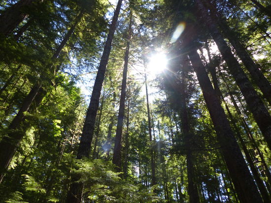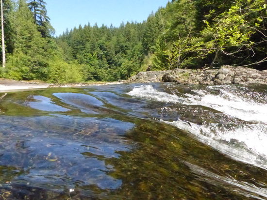 Die Zufahrt vom Hwy. 28 war leicht zu finden, ca. 15 Minuten von Campbell River , es gibt wie immer einen großen Parkplatz, Toiletten und Beschilderung. Schnell ist man auf guten Wegen in einem herrlichen sehr sehr grünen Wald, auf den Wasserfall blicken kann man von verschiedenen Plattformen und die Hängebrücke führt über die Schlucht zu einer weiteren Plattform. Wenn man den Wegen folgt, kommt man auf der anderen Seite der Fälle auf den flachen Felsen ganz nah ans Wasser (das dort noch recht flach ist). Dort legten wir eine Picknickpause ein - zum snacken, staunen und fotografieren. Die Sonne wärmte endlich uns und die Felsen wieder. Zum Auto zurück kamen wir über einen wunderschönen Trail durch den Wald. Aufgrund des Feiertags waren zwar einige Leute unterwegs, doch die verliefen sich im Gelände.