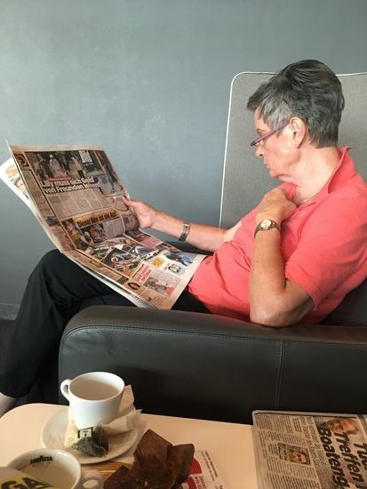 Der Zug ist rappelvoll, was ein Glück, dass ich Plätze reserviert habe; wir müssen sogar Leute 'verscheuchen'. Fürs Gepäck ist kein Platz mehr, es steht im Eingang, alle hoffen, dass in Köln der Ausstieg links ist, sonst ist das Chaos perfekt. In Köln wird dann -obwohl schon leicht verspätet - noch ein ICE angehängt, das erhöht die Verspätung natürlich weiter. Trotzdem haben wir um 14.00 Uhr schon eingecheckt und sitzen gemütlich in der Lufthansa-Lounge.