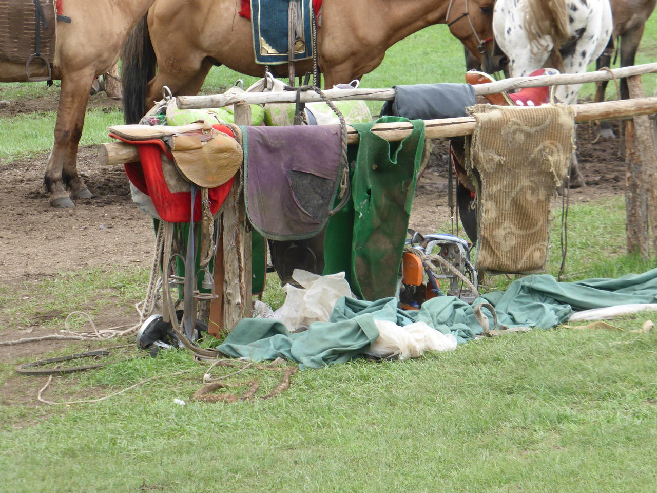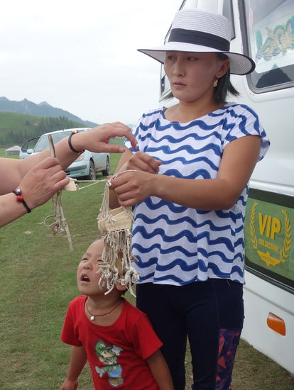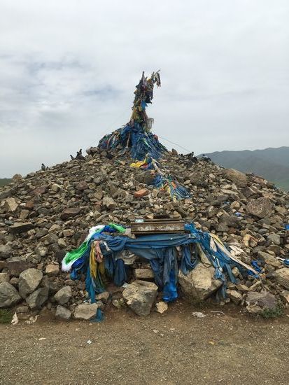 Zur Vertreibung der bösen Geister halten wir an einem großen Steinhaufen - Ovoo - mit Lappen, den man dreimal unrunden und einen Stein hinaufwerfen soll und sich dann etwas wünschen kann.