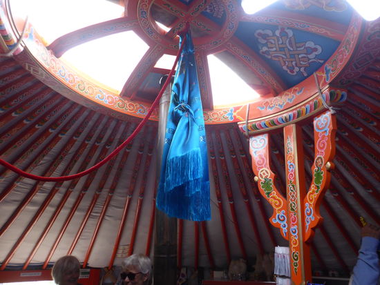Im Inneren steht sein Stiefel - ebenfalls etwas überdimensioniert - mir gefällt nicht, dass eigentlich nur Souvenirshops zu sehen sind, wie überhaupt das Ganze mir geschaffen zu sein scheint, um Touristen anzulocken. Natürlich müssen auch wir auf die Brüstung! (dem Dschingis Khan an den Hals)