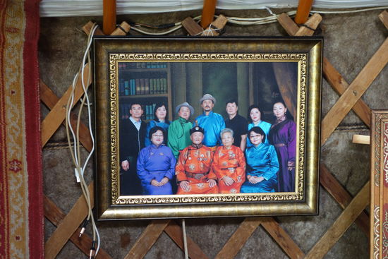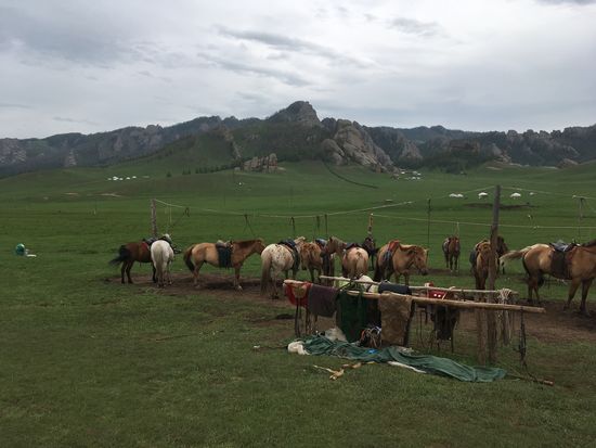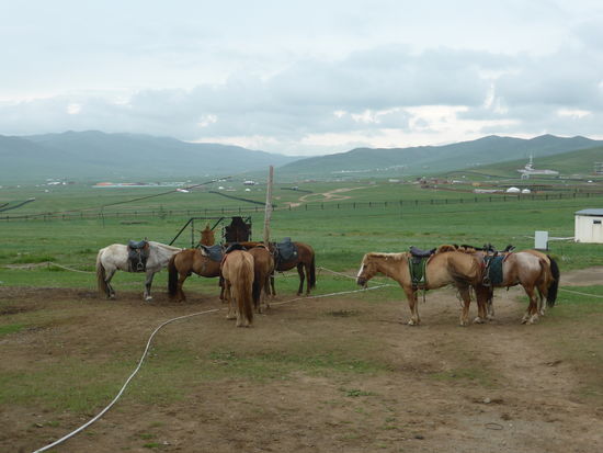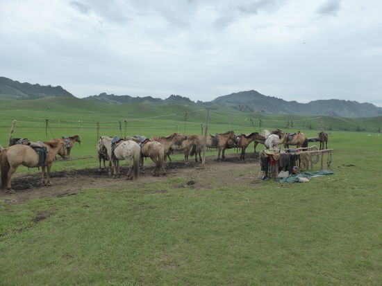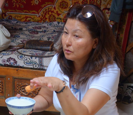 Da es sich bei unserem Ausflug um einen touristischen Ausflug handelt, fehlt natürlich auch ein Besuch bei Mongolen-Familie nicht, die hier (angeblich) den ganzen Sommer über lebt. DIe Jurte können wir innen besichtigen und auch die Stutenmilch, eine etwa 5% alkoholische vergorene 'Milch', und selbsthergestellten Käse sowie ein Käsegebäck probieren. Vor der Jute steht eine ganz Herde Pferde.